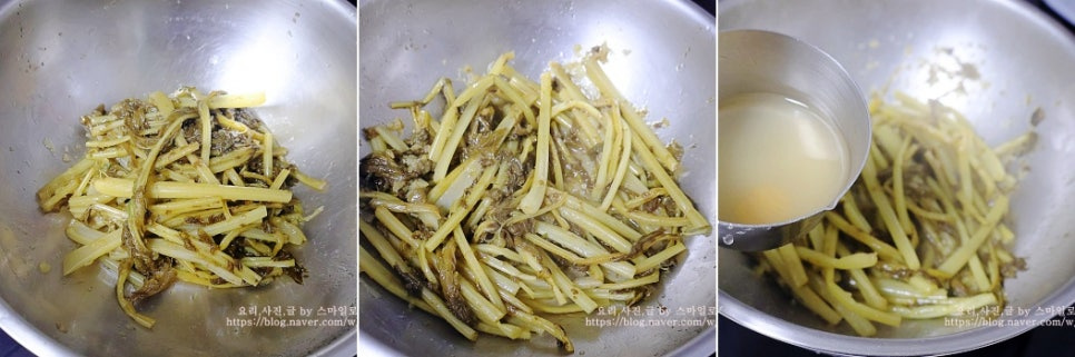밑간해놓은 시래기를 휘리릭 볶은 후 동전 육수 풀어놓은 육수를 부어줍니다