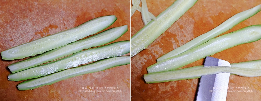 오이는 4등분한 후에 가운데 씨를 칼로 도려냅니다