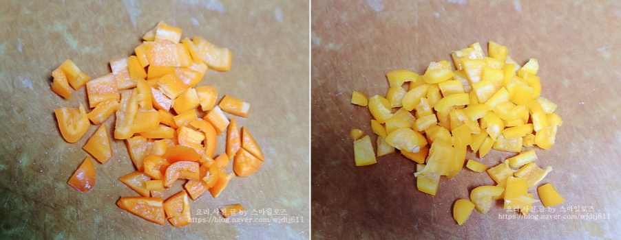 파프리카는 반으로 자르고 씨가 있을 경우엔 씨를 제거해 줍니다