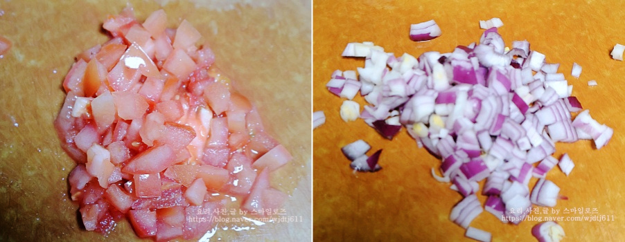일반 토마토와 자색양파도 비슷한 크기로 썰어줍니다