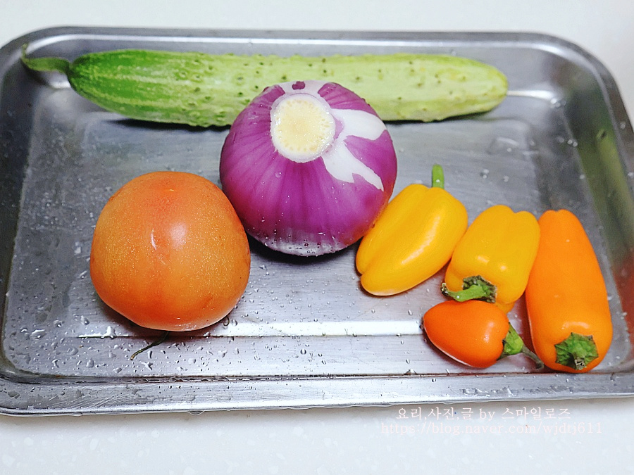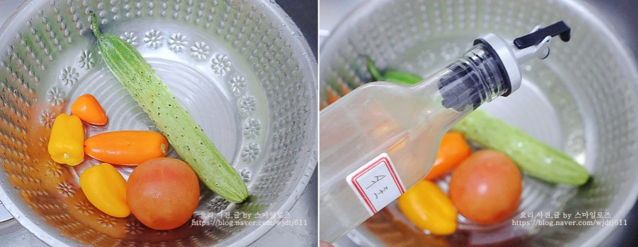 오이와 토마토 파프리카는 식초 2큰술을 푼 물에 담가놓았어요