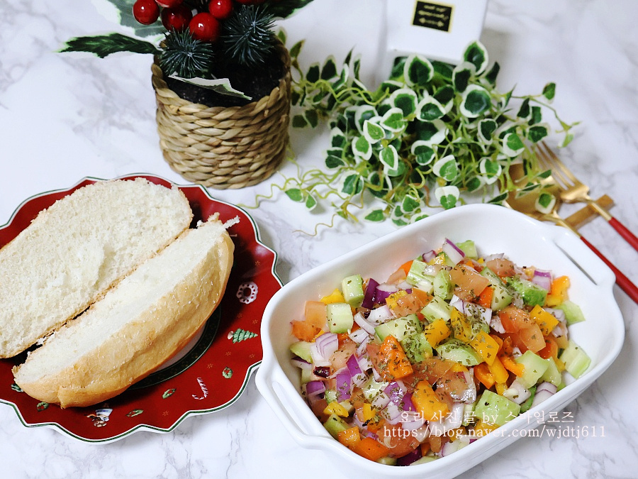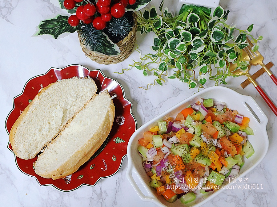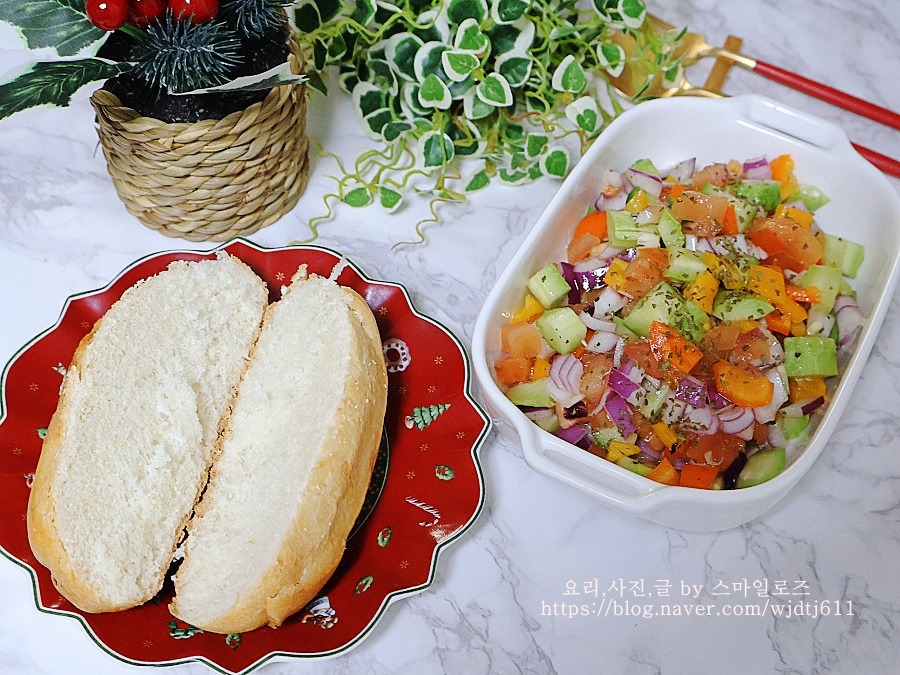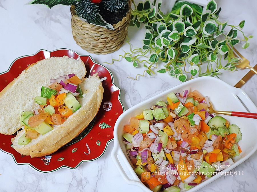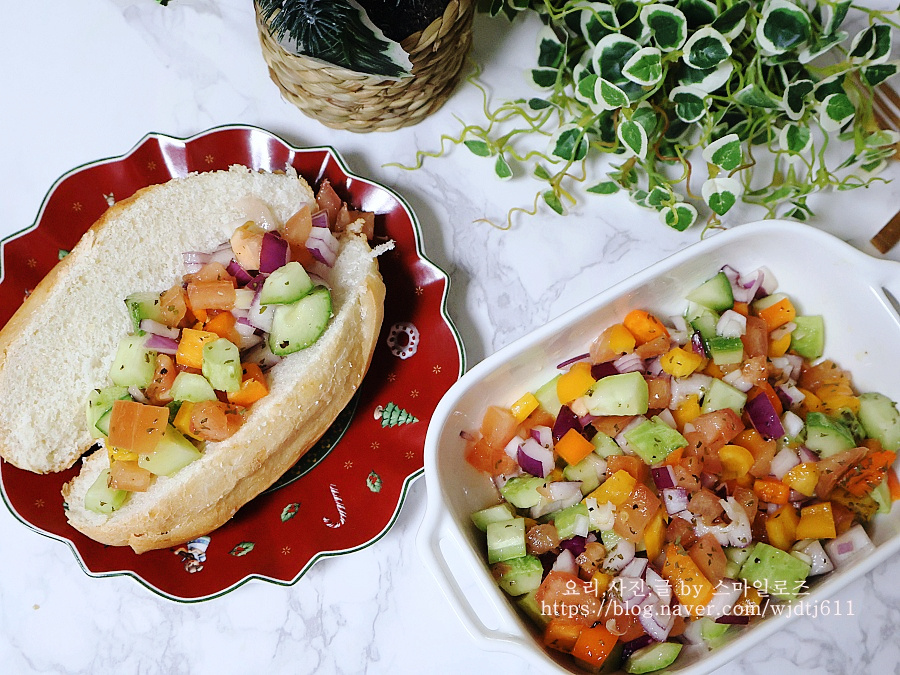미니 바게트에 만들어 놓은 샐러드 올려 먹으면 더욱 맛있게 먹을 수 있어요
