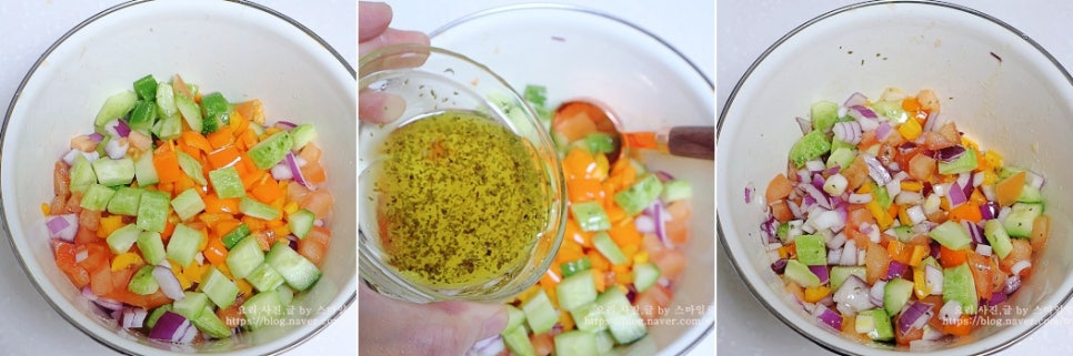 야채들 썰어놓은 것을 모두 한군데 담은 뒤에 샐러드소스 뿌려 골고루 섞어주면