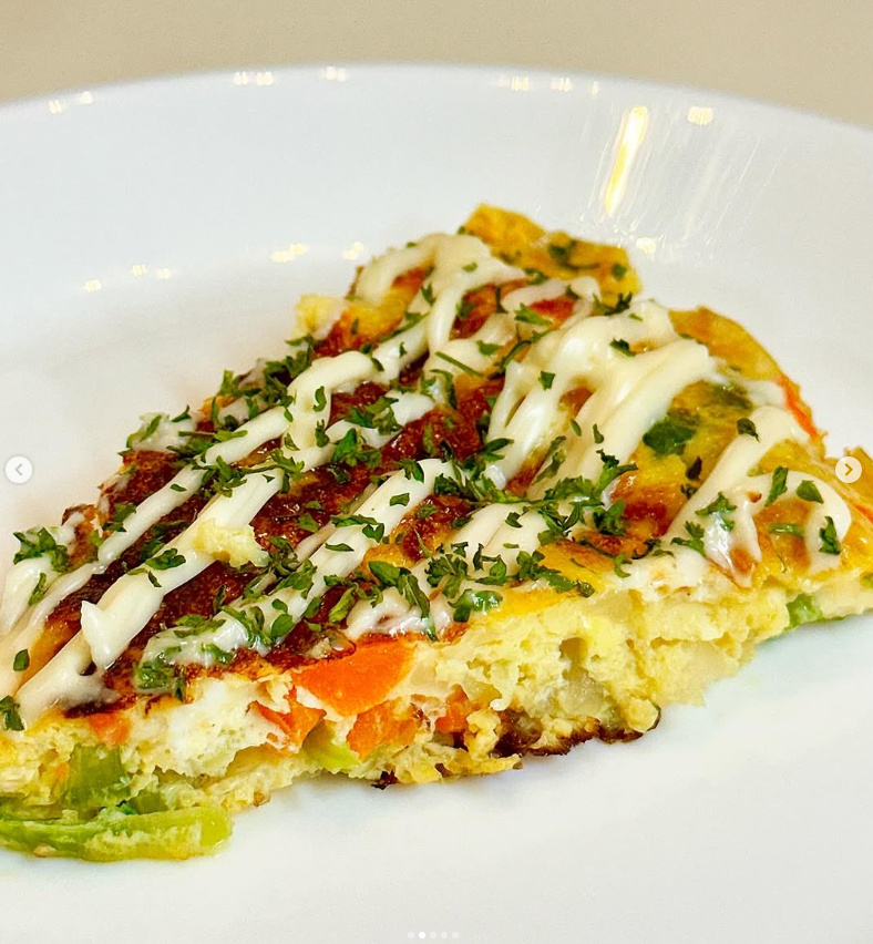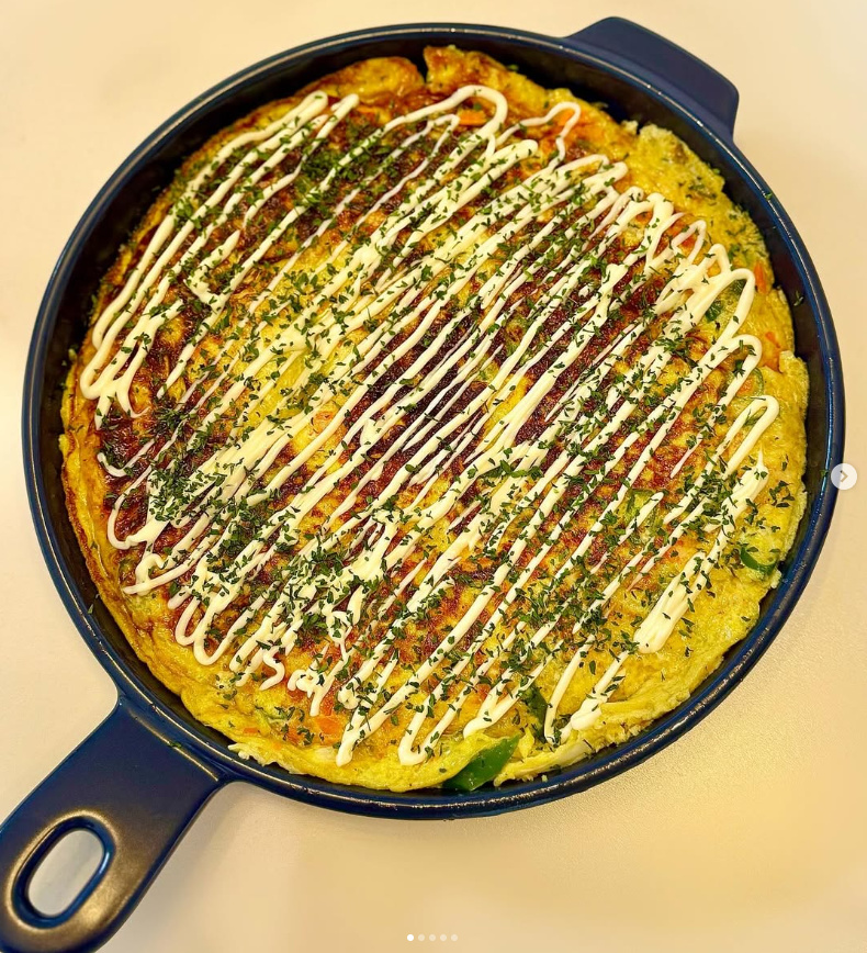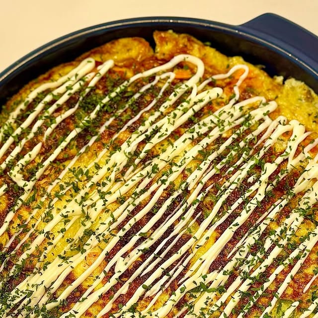 4️⃣ 접시에 담아 파슬리와 마요네즈로 오꼬노미야끼 느낌으로 데코하면 완성!
