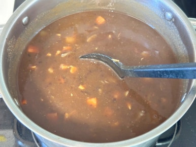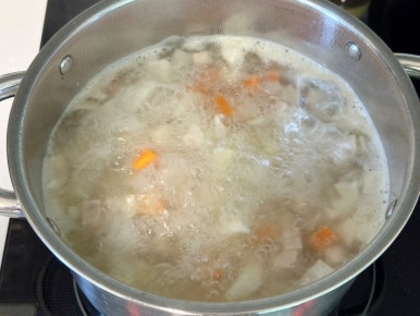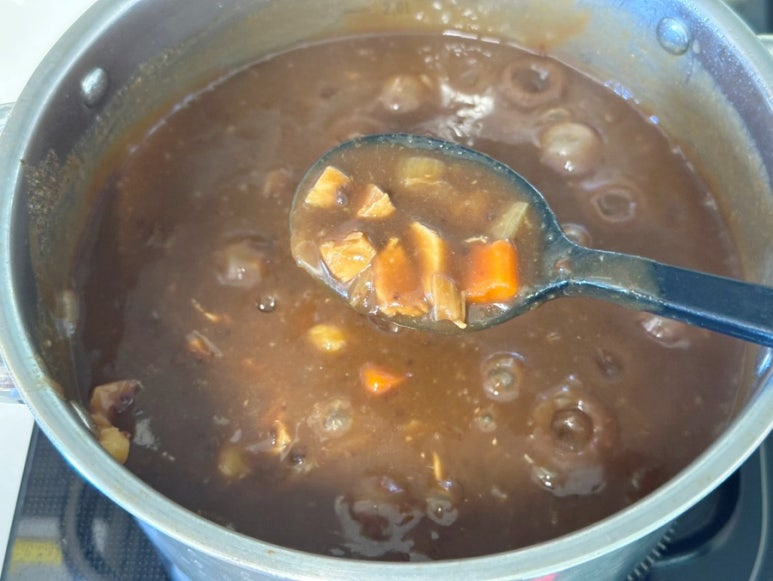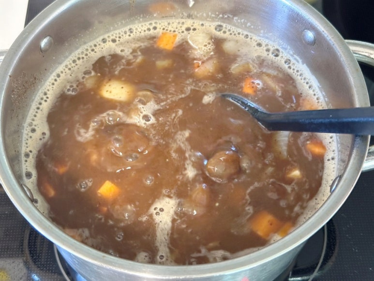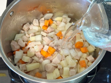 하이라이스소스 200g , 케첩 1T , 닭가슴살 200g , 감자 2개 , 양파 1개 , 당근 1/2개 , 물 1L , 식용유 1T