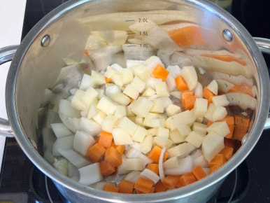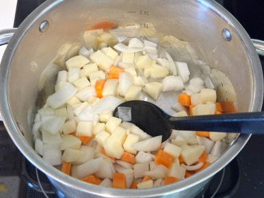 썰어둔 야채를 먼저 넣고 볶아주세요