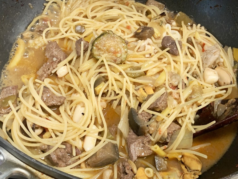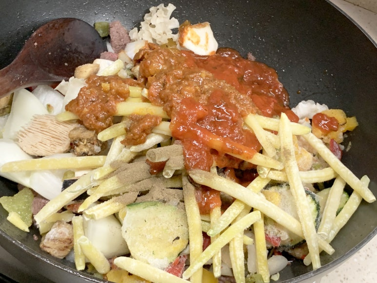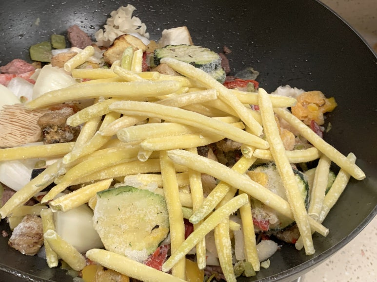 남은 찹스테이크에 모둠해물을 조금 넣어서 볶아 주었습니다.