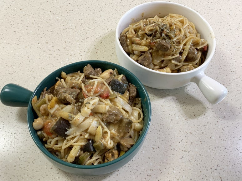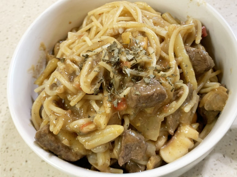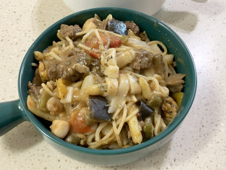 그럼 찹스테이크파스타 완성입니다.
