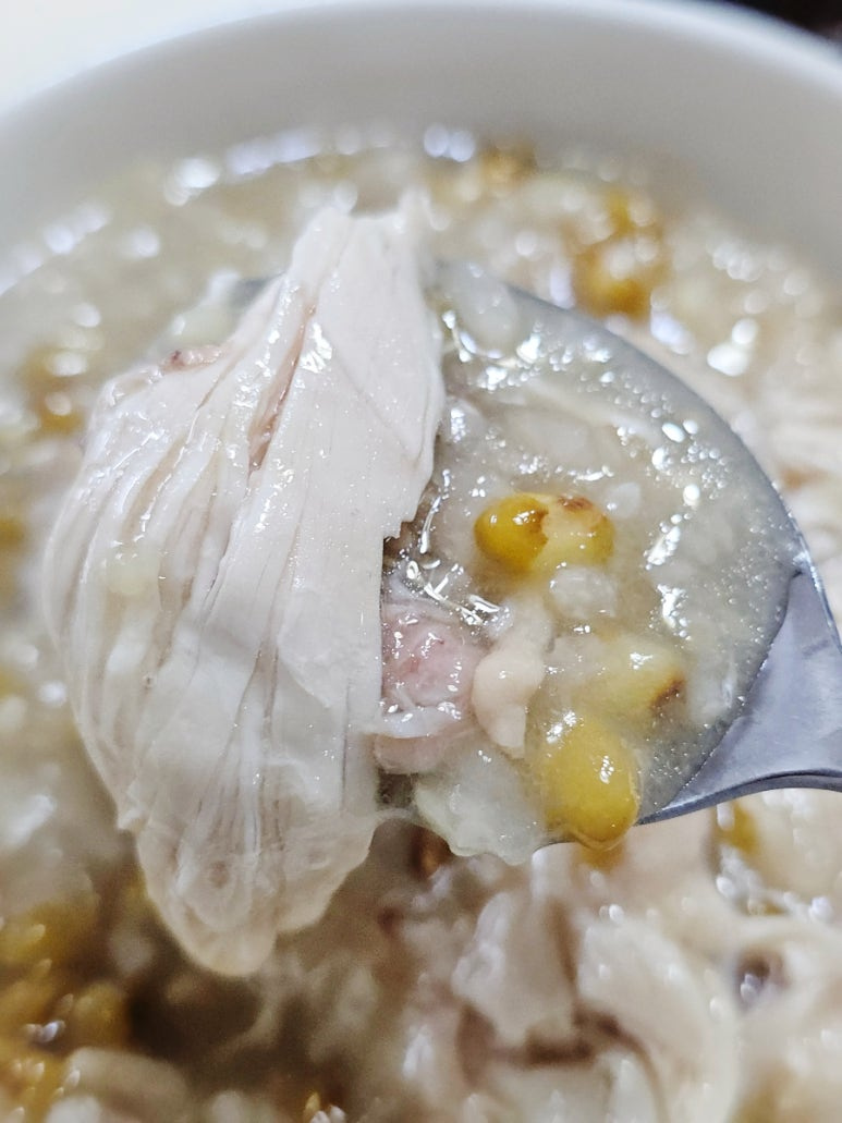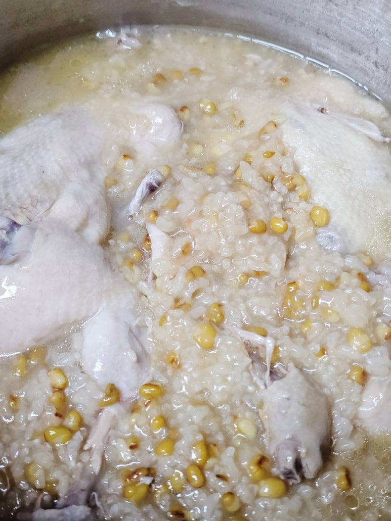 영계 생닭 2 마리 , 찹쌀 1.5 컵 , 녹두 1 컵 , 소금 1-2 T