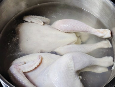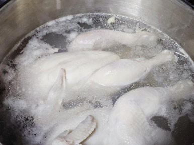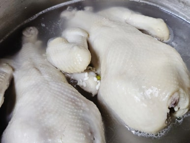 데친 닭은 흐르는 물에 3-4회 차례 세척합니다.