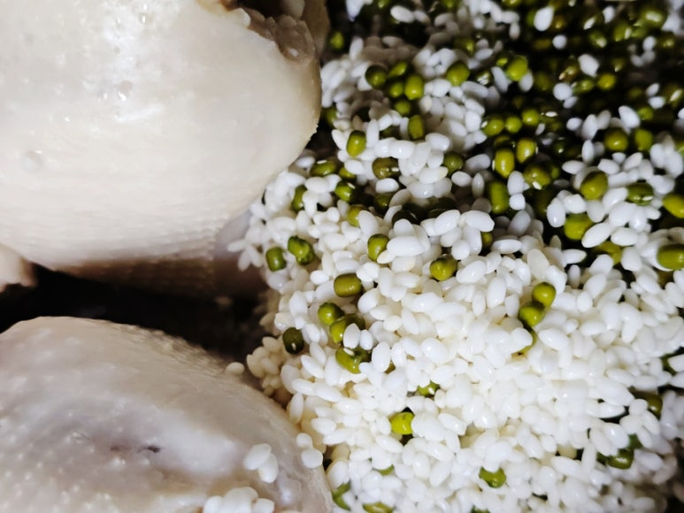 압력밥솥에 찹쌀과 녹두를 넣습니다.