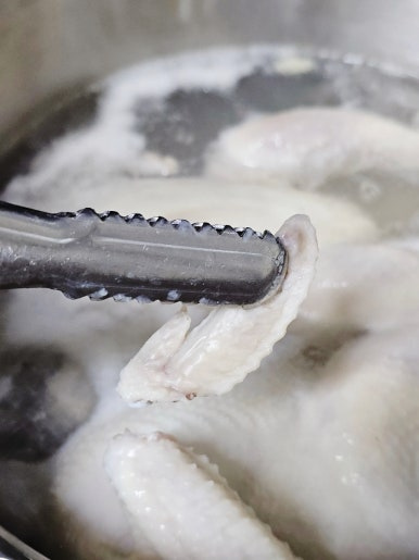 끓인 물에 생닭을 1-2분간 데쳐줍니다.