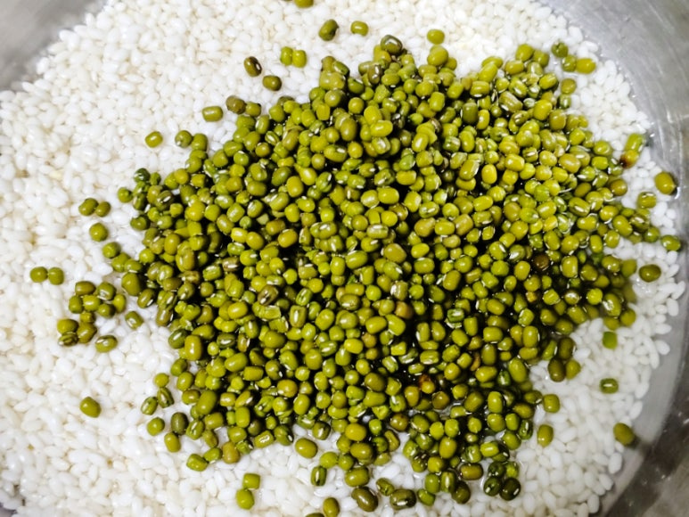 찹쌀과 녹두를 흐르는 물에 씻어 준비해요.