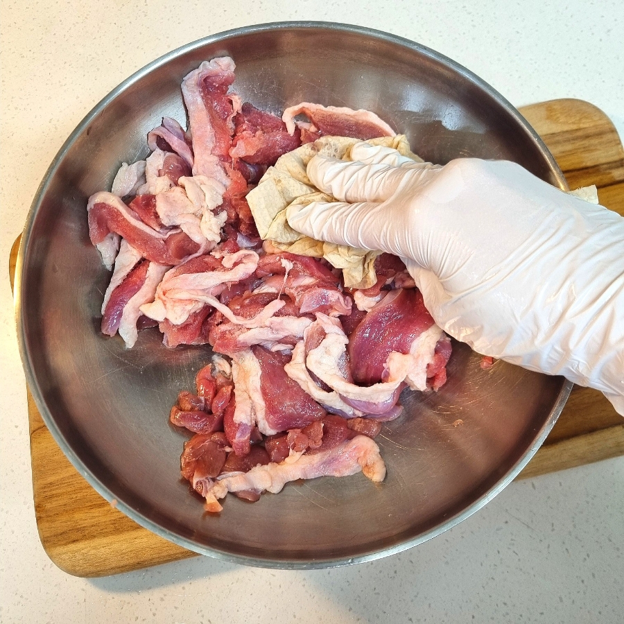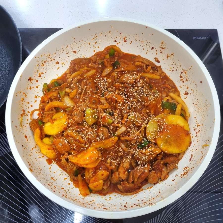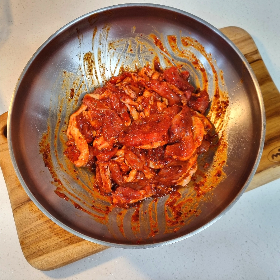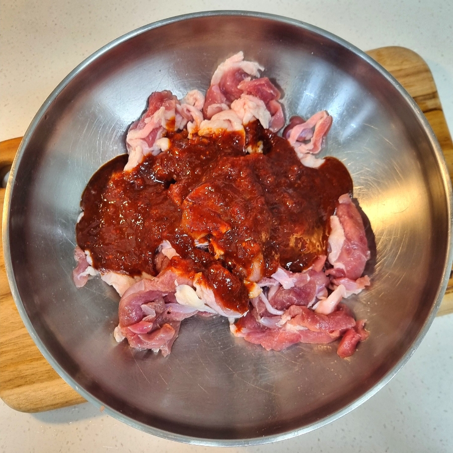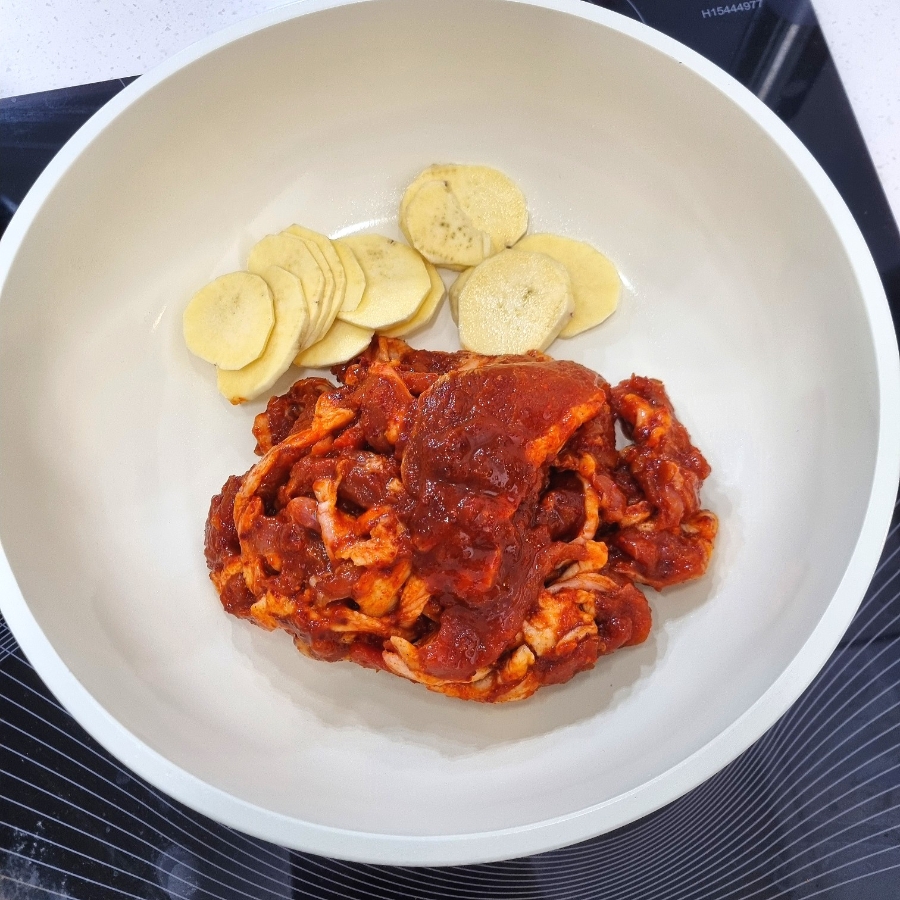 양념에 재운 오리고기, 고구마를 넣어주세요
