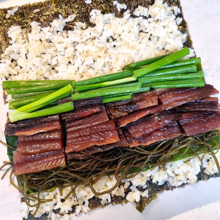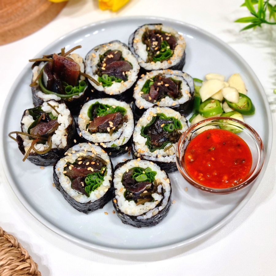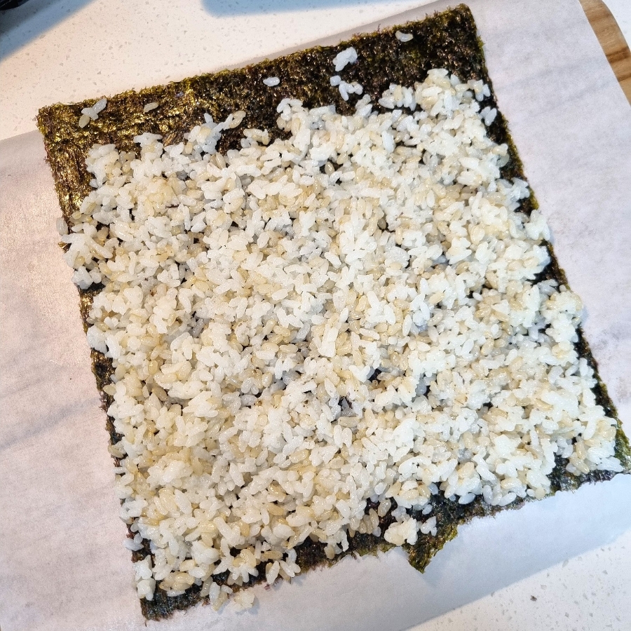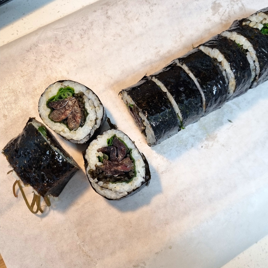 꾹꾹 눌러가며 김밥을 돌돌 말아주세요