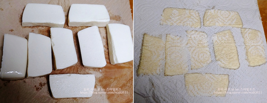 조금 도톰하게 썬두부를 키친타월 위에 올려놓고