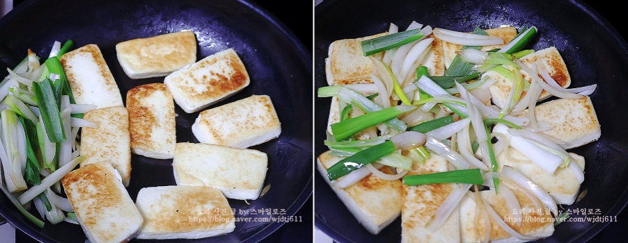 두부를 구운 팬에 대파와 양파를 볶아줍니다