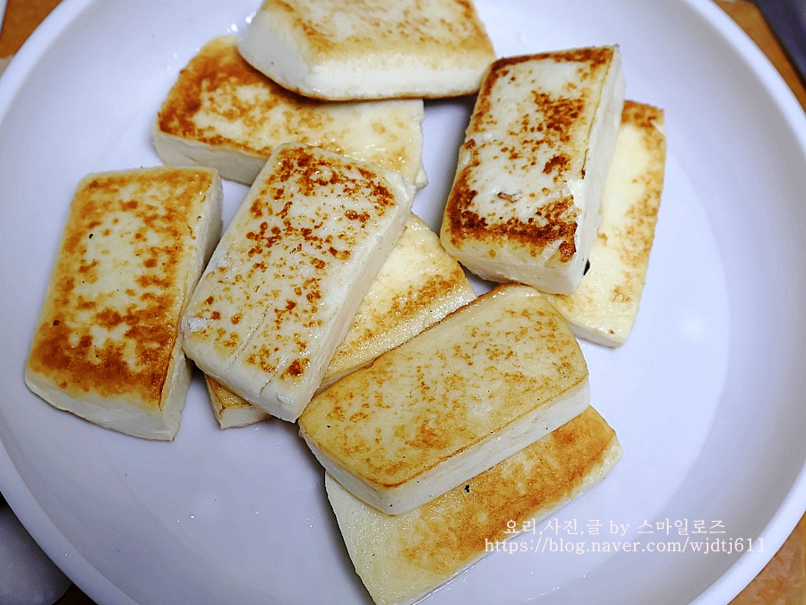 노릇하게 잘 구워진 두부는 잠시 다른 그릇에 담아 놓았어요