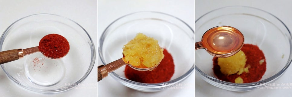 고춧가루 2큰술, 다진 마늘 1큰술, 맛술 2큰술을 넣고