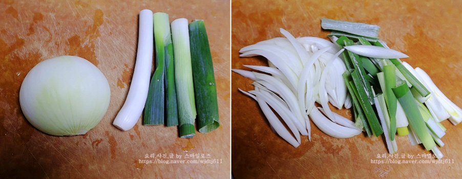 양파는 도톰하게 채 썰고 대파는 4cm 정도 위 길이로 썬 다음