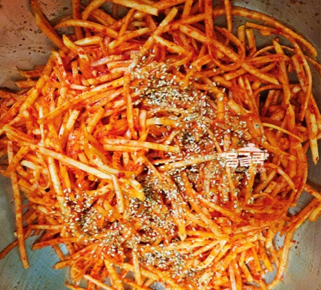 이 과정을 거치면 콜라비의 수분과 고춧가루가 먼저 만나