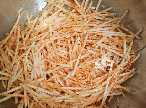 채 썬 콜라비에 고춧가루 1큰술을 먼저 넣고