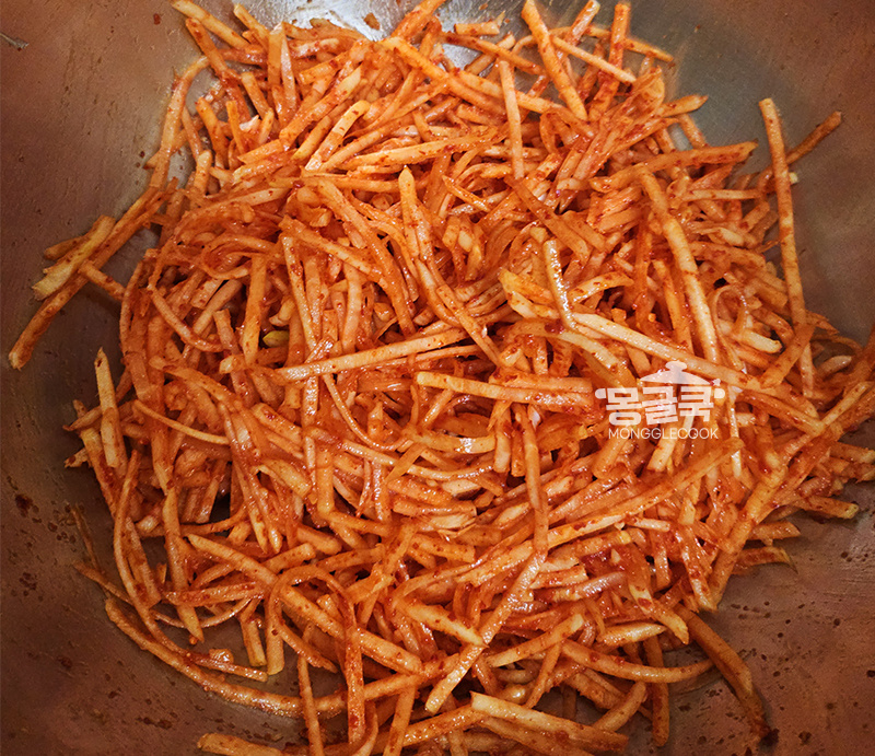 손에 힘을 빼고 살살 버무려 주세요.