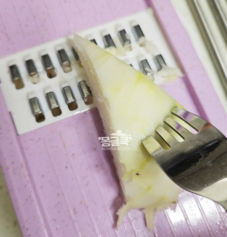 콜라비가 작아져서 손이 위험할 땐 포크로 콕 찍어서 밀어보세요.