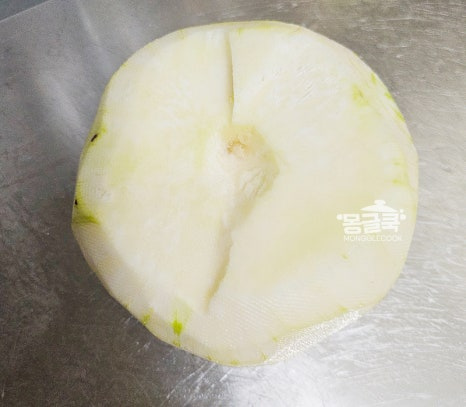 손질한 콜라비는 약 0.3~0.5cm 두께로 채 썰어주세요.