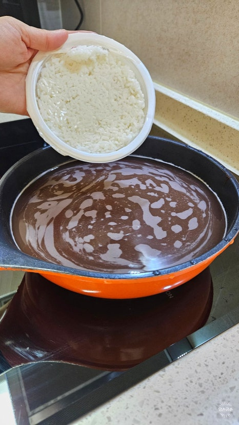 팥퓨레 2 봉 , 찹쌀가루 120 g , 뜨거운 물 80 ml (반죽용), 햇반 1 개 , 물 1 L , 소금 2/3 T , 설탕 3 T