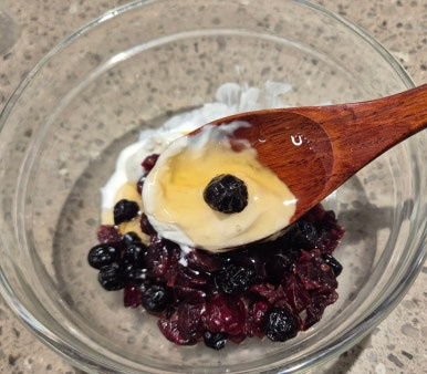 크릭 요거트를 볼에 담고 크린베리와 꿀을 넣고 버무려서 소를 완성해 주세요