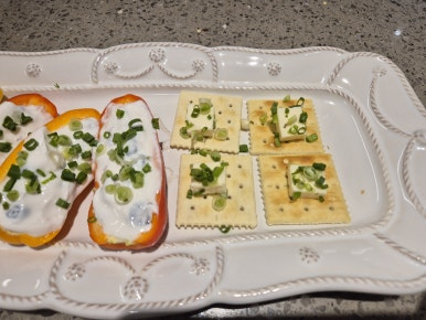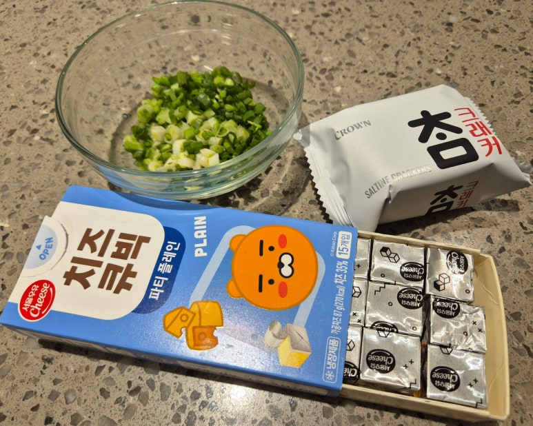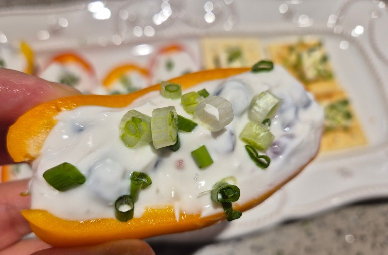큐브 치즈는 반으로 자른 후 썰어 놓은 쪽파를 묻혀서 크래커 위에 얹어주기만 하면 됩니다 하나는 아삭한 파프리카와 그릭 요거트