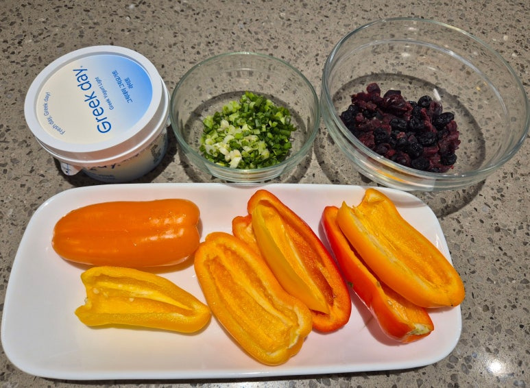 트리벨리 파프리카 or 미니파프리카 , 그릭 요거트 적당히 , 크린베리 or 블루베리 적당히 , 쪽파 1뿌리