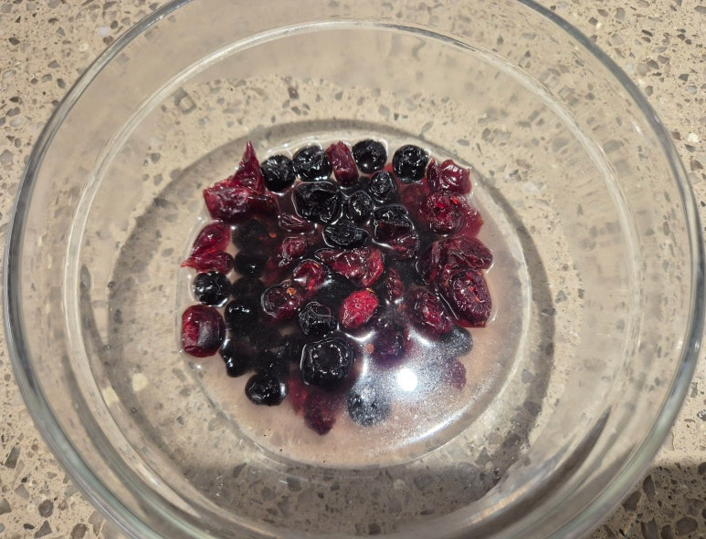 저는 건 크린베리와 건 블루베리를 함께 준비했어요 냉동된 것이라서 다 뜻한 물에 5분 정도 담가서 물기를 빼놓아요