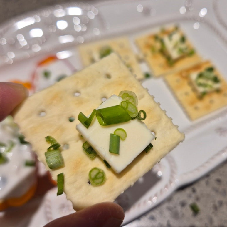 다른 하나는 바삭하고 단백한 크래커 위에 큐브 치즈와 쪽파가 조화로운 카나페입니다 크리스마스 홈 파티에 만들어 보시는 것 어떨는지요