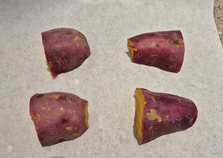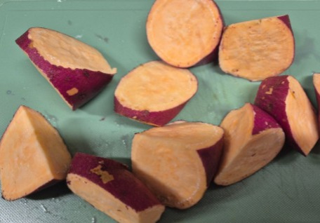 고구마를 껍질까지 사용할 것으로 솔로 빡빡 닦아주세요 고구마에는 베타카로틴과 안토시아닌 성분이 풍부한 건 아시죠 특히 껍질에 좋은 성분이 더 많아서 활성산소로부터 세포를 보호해 주는 역할을 하며 노화 예방과 면역력 향상에 도움을 주며 장 건강에도 좋은 식이섬유도 풍부해 배변 활동에 도움이 됩니다 닦은 고구마를 4 등분으로 자릅니다 크기에 따라 등분을 조절하세요