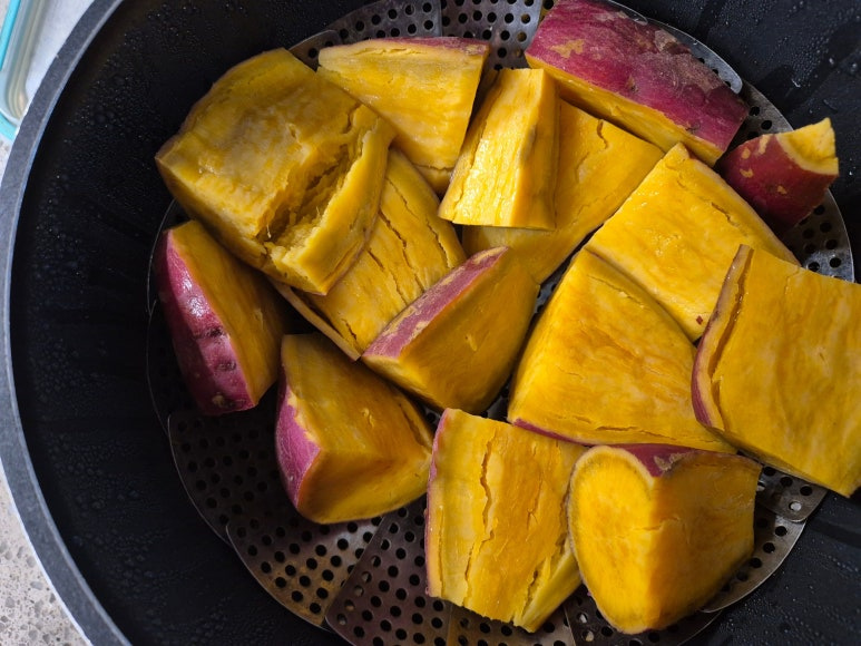 자른 길이가 6~7cm 정도면 좋아요 4등분으로 자른 고구마를 15분 정도 쪄서 꺼내주세요