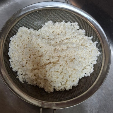 체를 활용해서 물기를 뺀 불린 쌀을 넣어줍니다