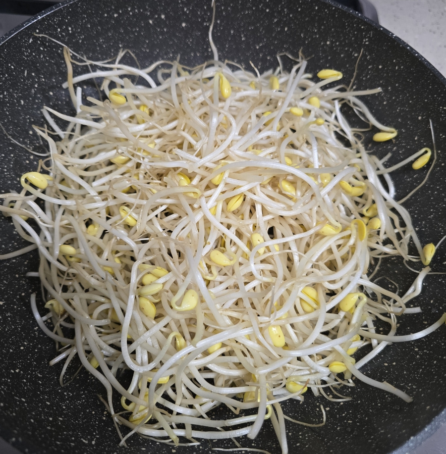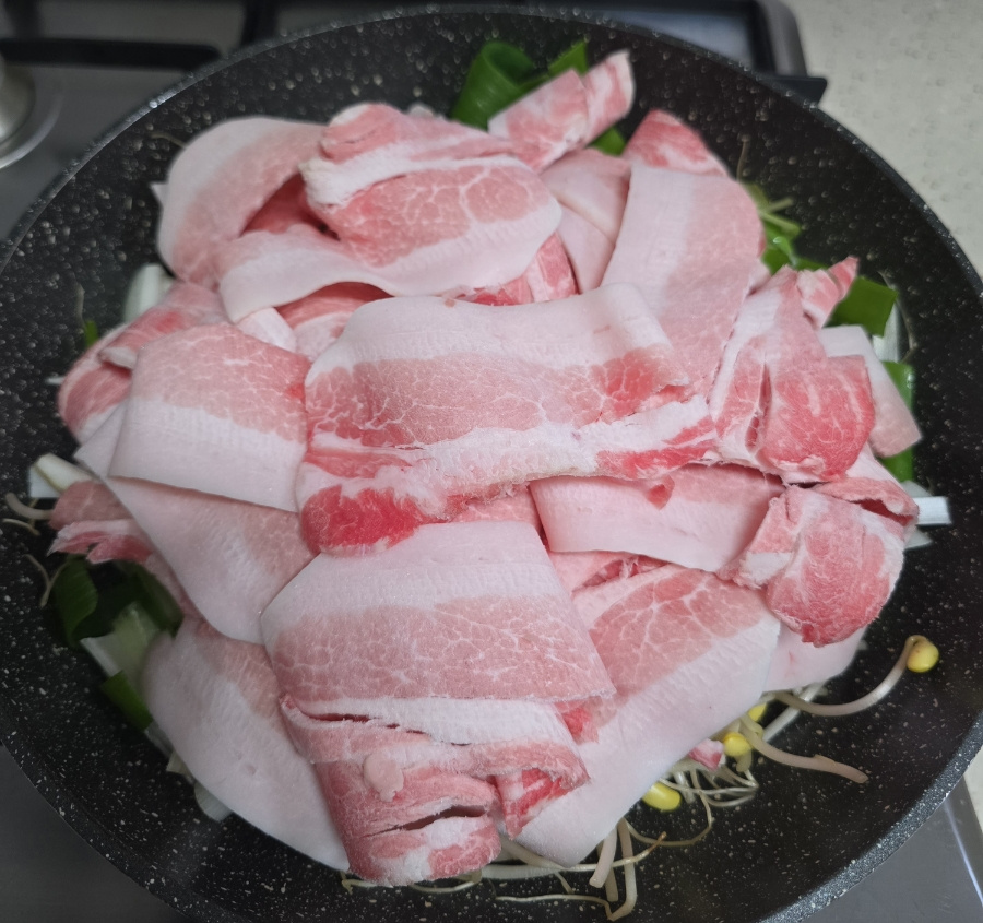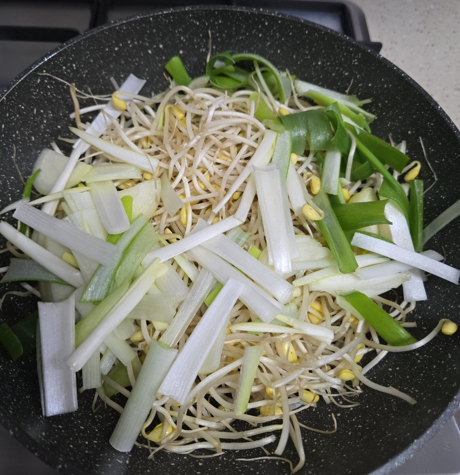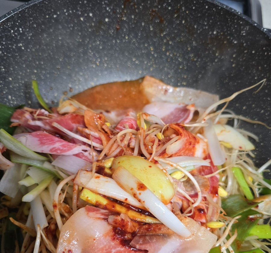 콩나물은 수분이 정말 많은 채소거든요. 처음부터 막 휘저으면 콩나물 숨이 다 죽어서 물이 흥건해지고, 아삭함은커녕 질척거리는 요리가 돼버려요. 콩나물이 바닥에서 수분을 충분히 내보내고, 그 증기로 고기가 우아하게 익을 때까지 우리는 우아하게 기다려야 해요. 명심하세요, 무심한 득 툭 올려두는 게 이 요리의 가장 큰 비법이라는 거...