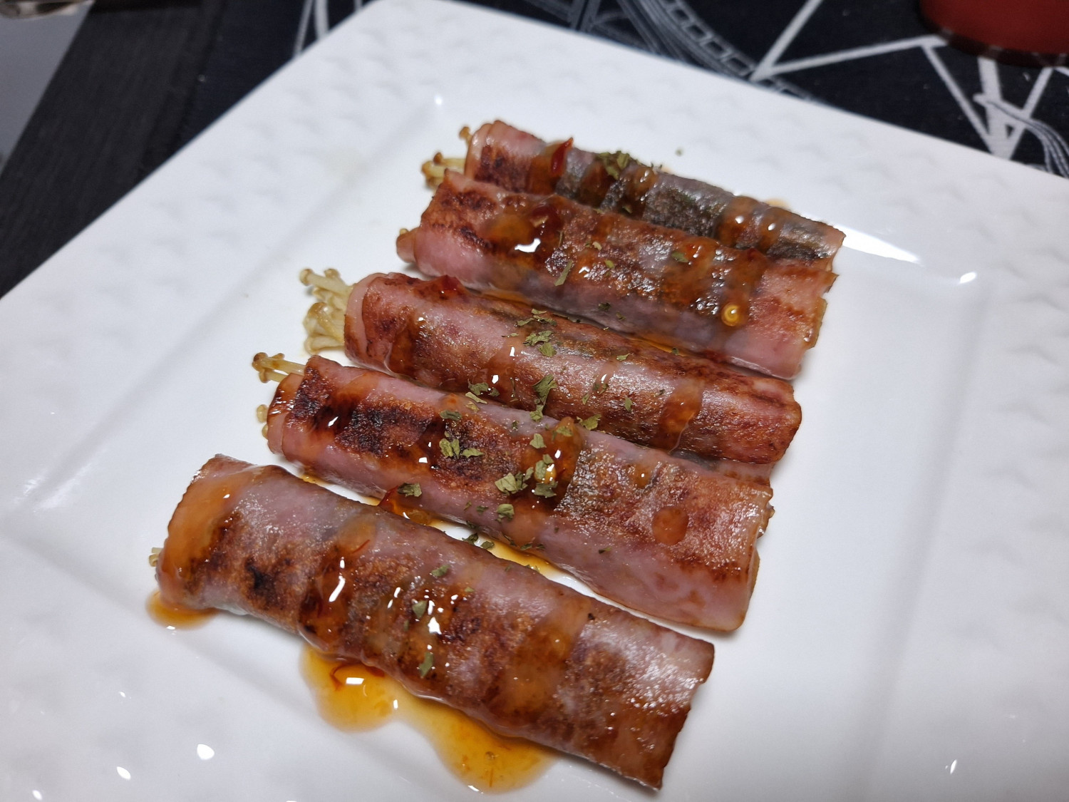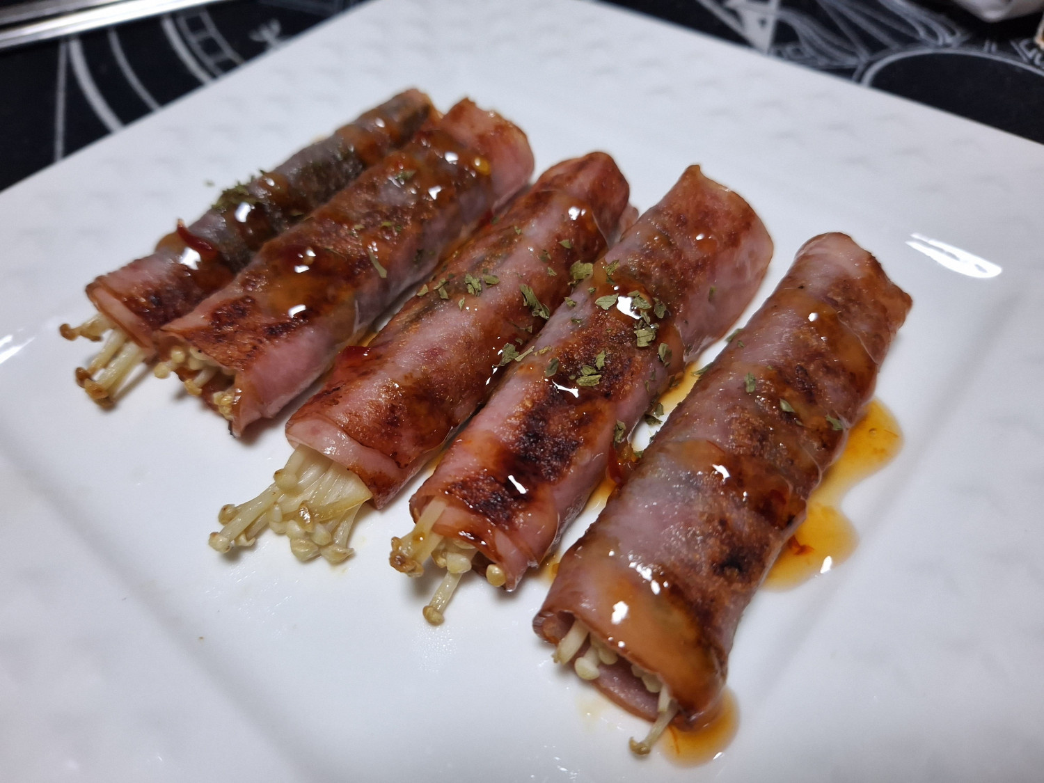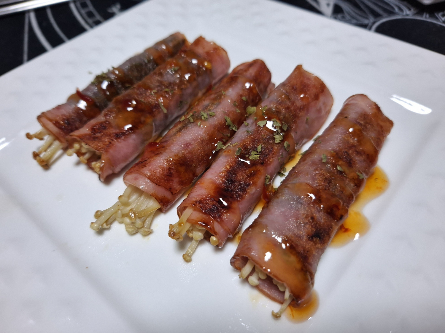 그리고 말아둔 팽이버섯깻잎햄말이를 올려주는데요.