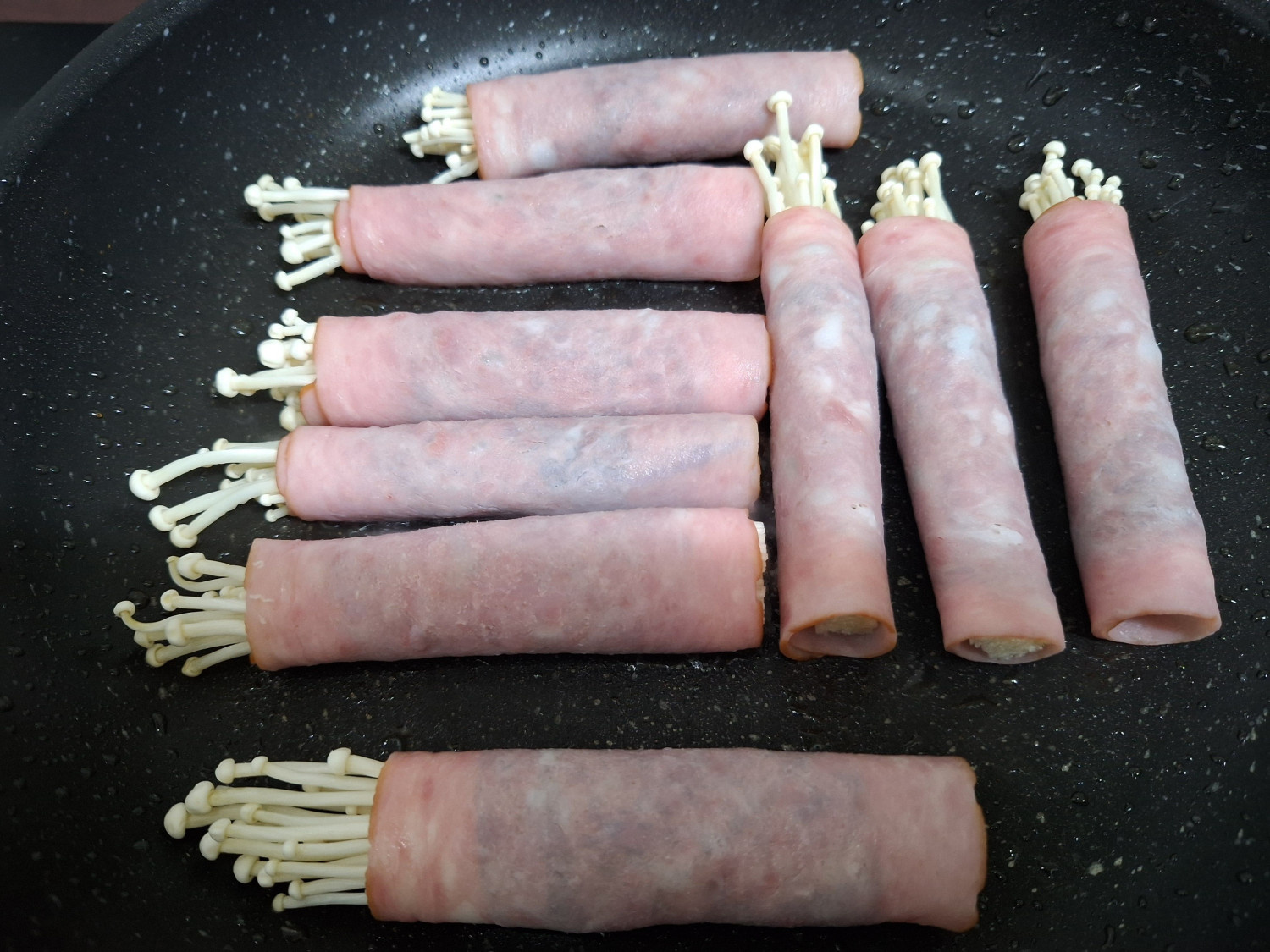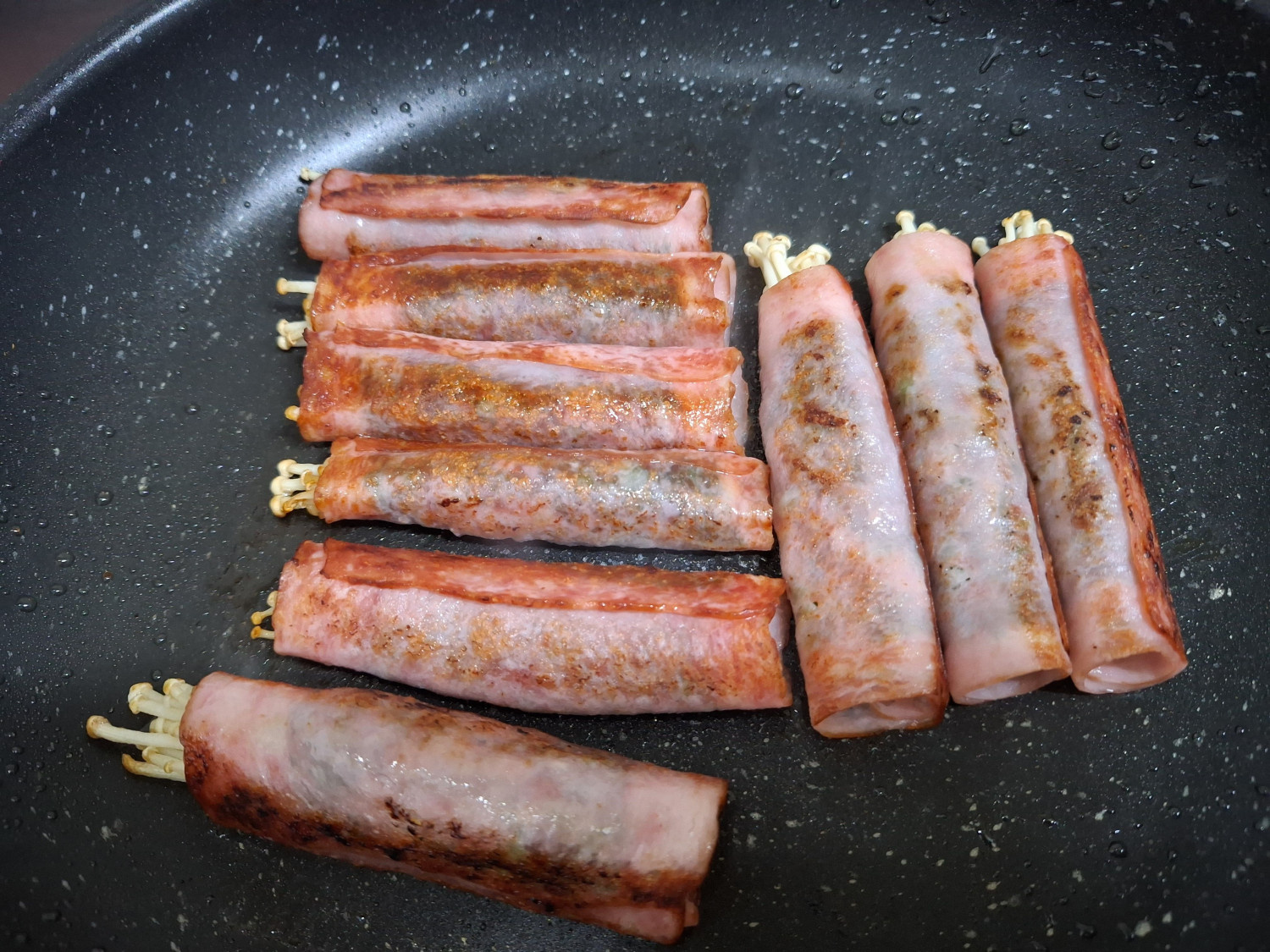 팽이버섯과 햄은 꼭 완벽하게 구워야 탈이 나지 않습니다.