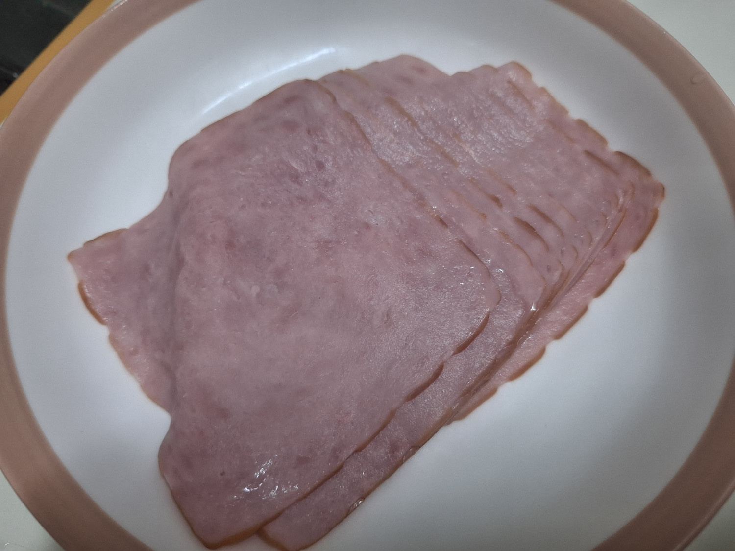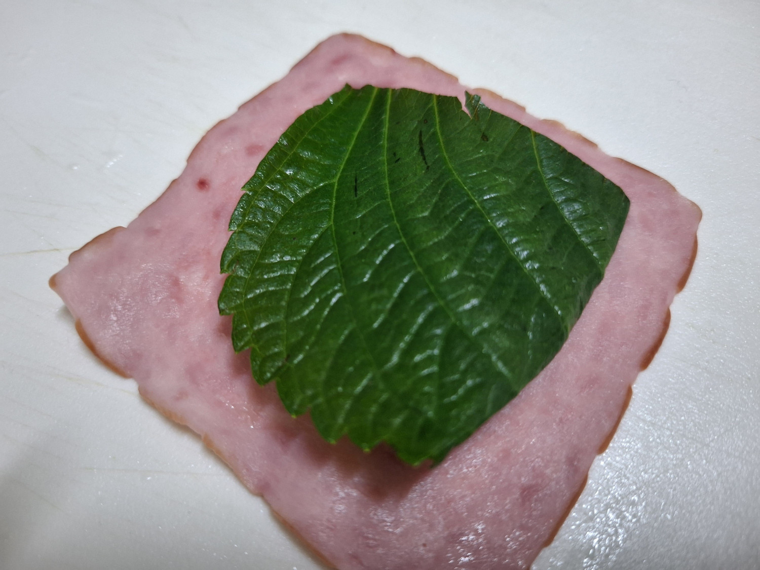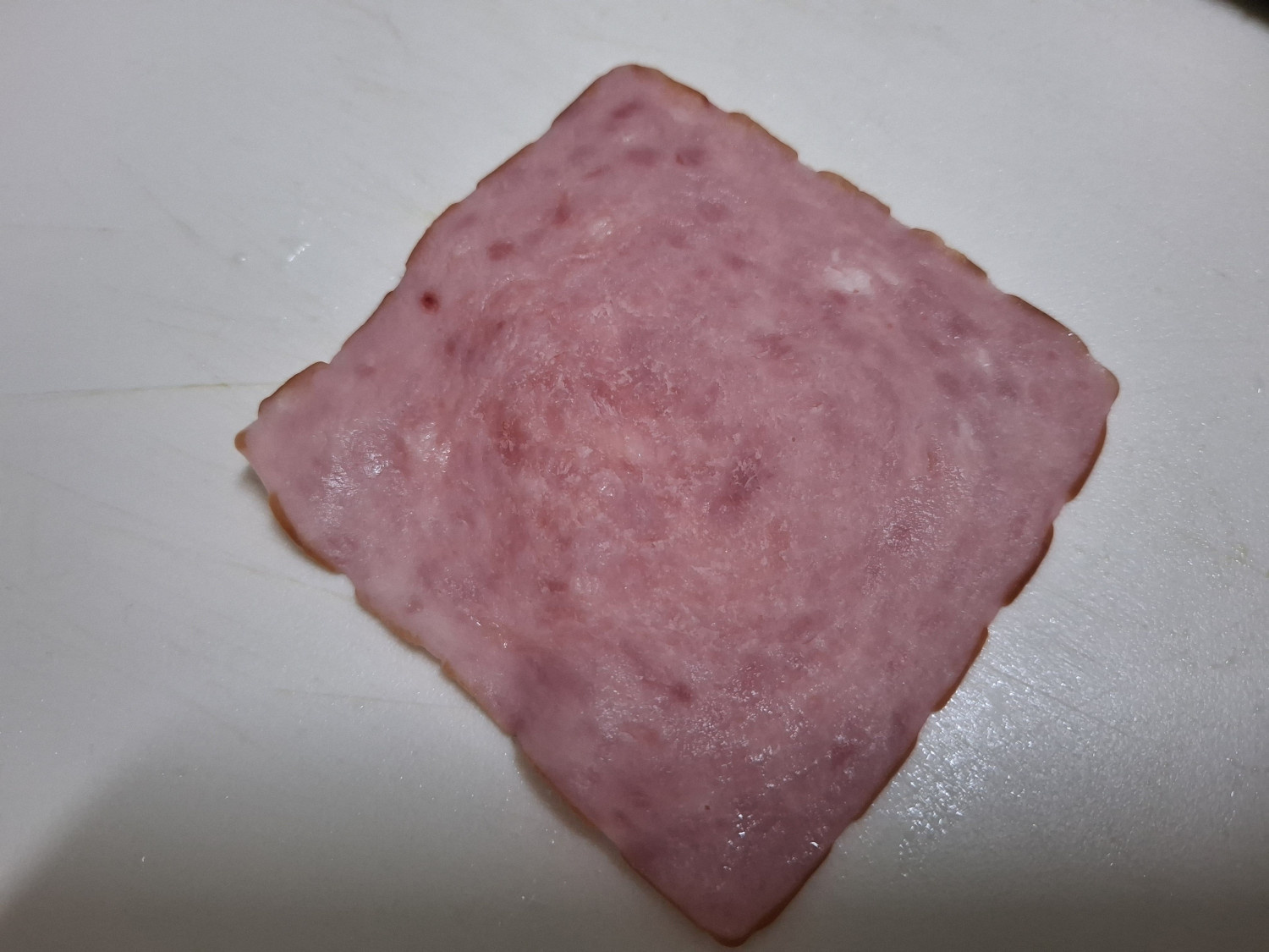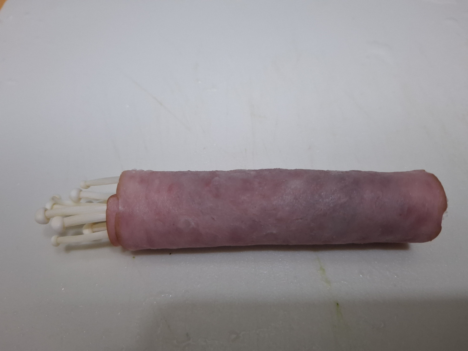 먼저 평평한 곳에 햄을 반듯이 깔아줍니다.
