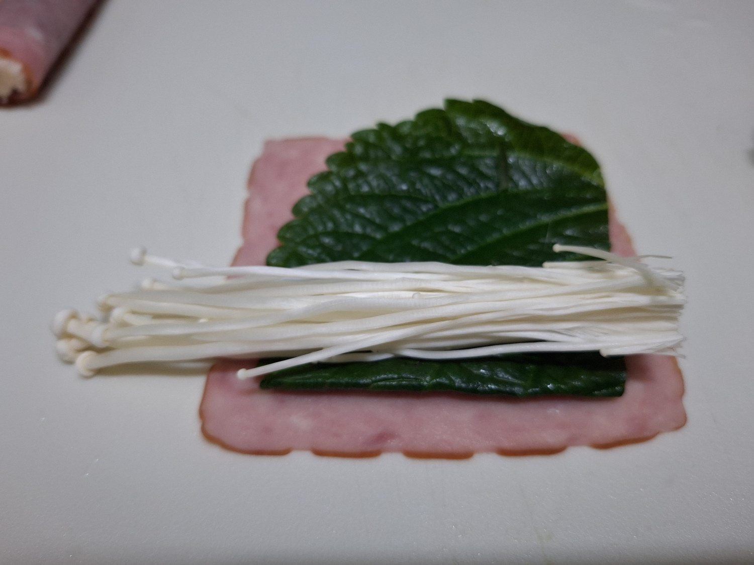 그 위에 찢어둔 팽이버섯을 올리고 돌돌 말아주면 됩니다.
