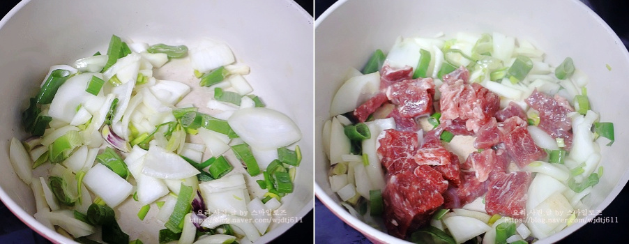 중강 불로 불을 올리고 소고기를 넣고 고기가 익은 색이 나도록 볶아줍니다