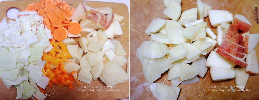양배추 감자 사과 당근 모두먹기 좋은 크기로 썰어놓았어요