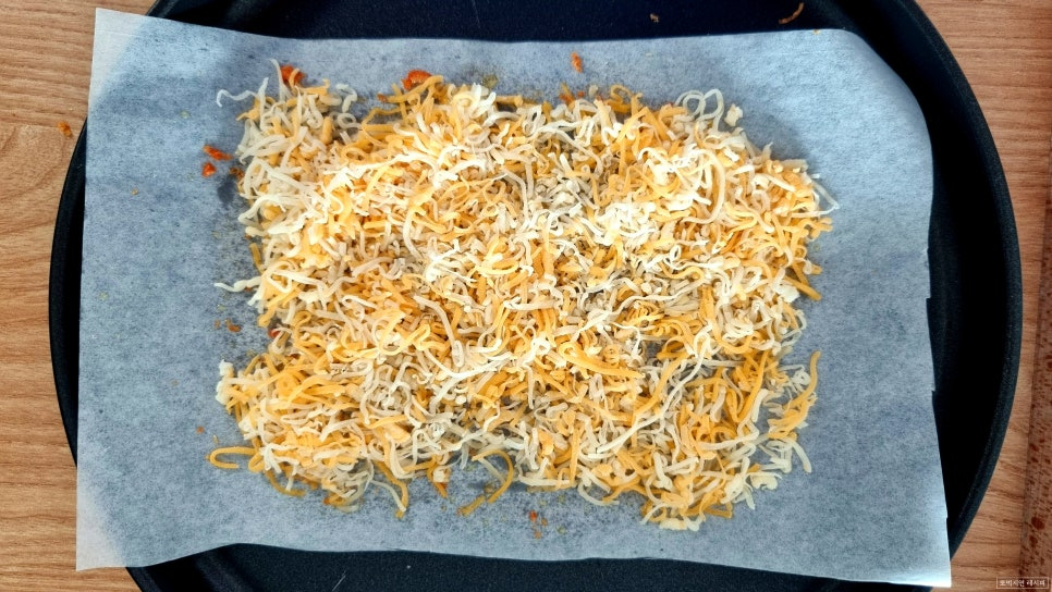 그 위에 슈레드 치즈를 얇고 고르게 펼쳐주세요.