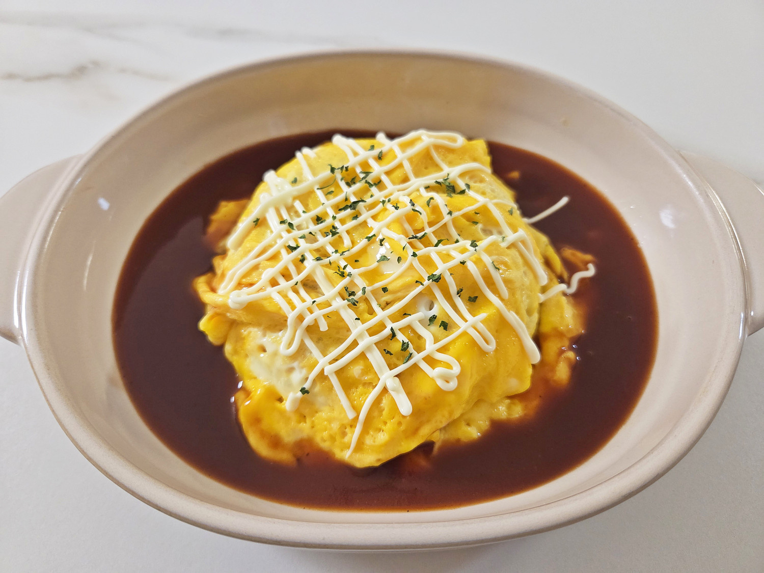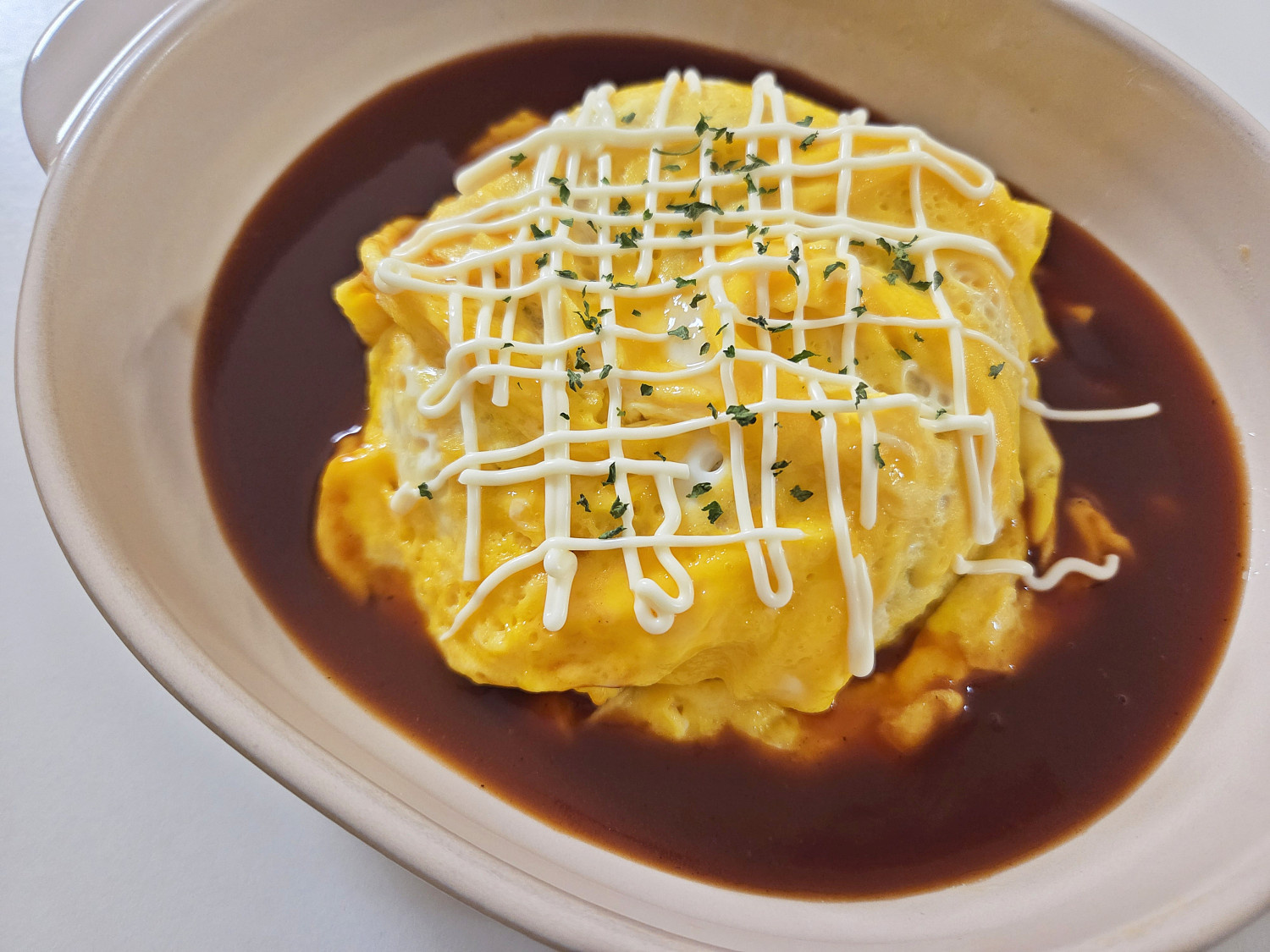 그릇에 볶음밥을 담고 그 위에 회오리 계란 이불을 덮어준 다음 오므라이스 소스를 뿌려주기만 하면 끝이에요.