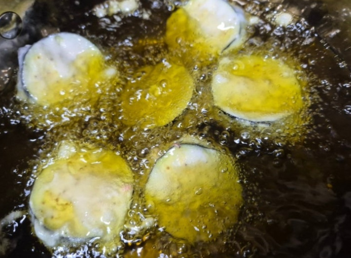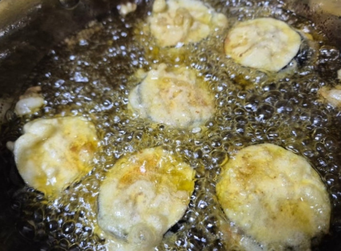 튀김 기름 170도에 새우 가지 튀김을 튀겨줍니다. 1분후 뒤집기