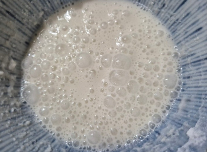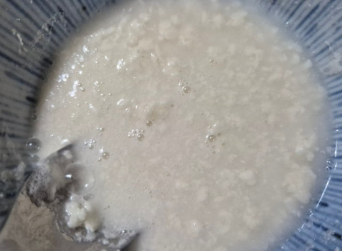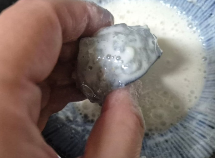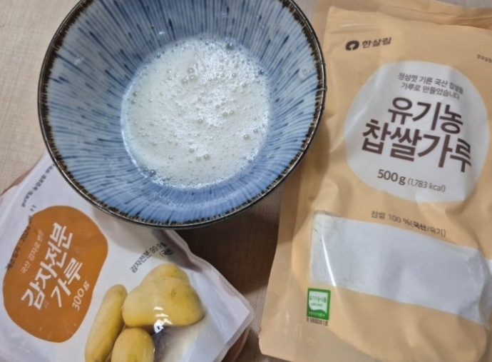 비율은 안 알려주셨지만.. 달걀 찹쌀가루 감자전분이 들어간다고 하셨어요. 색상이 노란색이 전혀 없기에 달걀 흰자만 사용했을 것 같았습니다. (추측) 하루전 날 미리 만들면 숙성이 되어서 튀김이 더 바삭하다고 하셨네요. [재료] 달걀 흰자 1개 감자전분2T:찹쌀가루2T 비율로 했어요. 흰자를 먼저 풀어주고 찹쌀가루 20g, 감자전분 20g을 넣어서 숟가락으로 저어요.