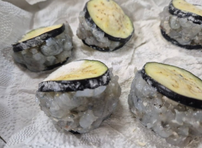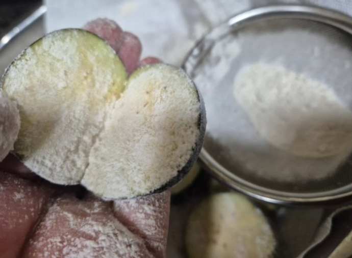 고운소금,후추를 살짝 뿌려 밑간을 해요. 셰프님은 가지에 밀가루를 뿌리지 않았지만.. 흡착이 되려면 고운체망을 이용해서 밀가루를 안,밖에 가볍게 뿌려주는 걸 추천해요.
